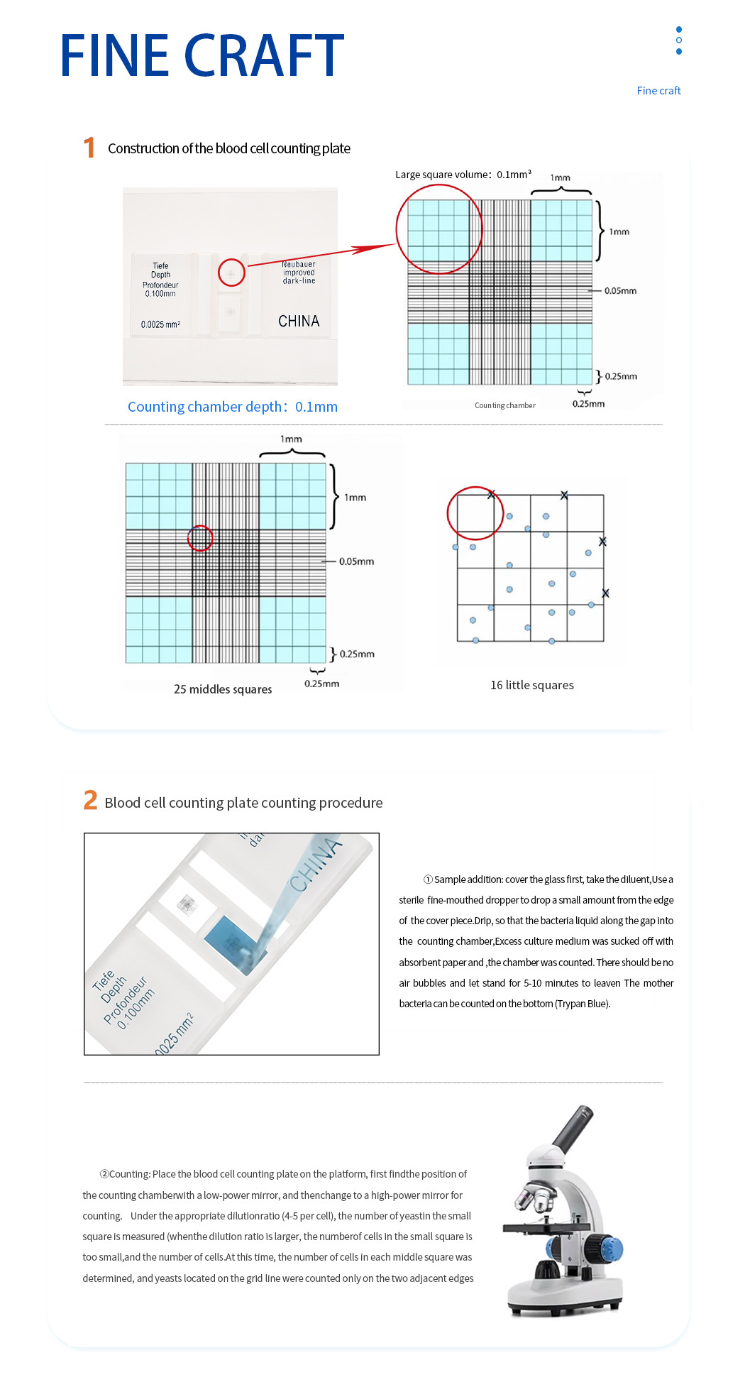 4. When counting, the focal length should be adjusted from time to time to observe samples at different depths;5. Do not use a blood cell counting board beyond its expiration date.