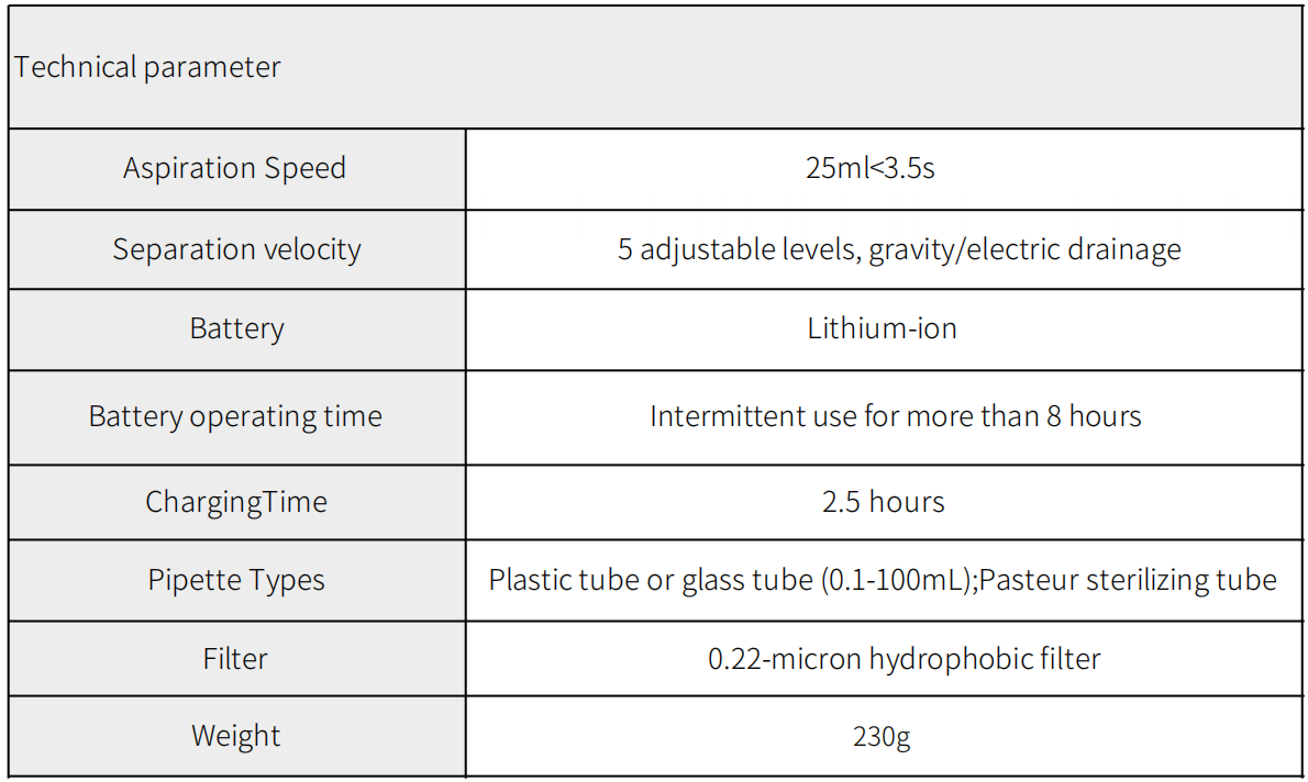 Fingertip control of the suction and liquid separation buttons to ensure the accuracy of pipetting; PVDF material, corrosion resistance; Replaceable lithium battery, long service time, intermittent work for 8 hours, charging time 2-3 hours.