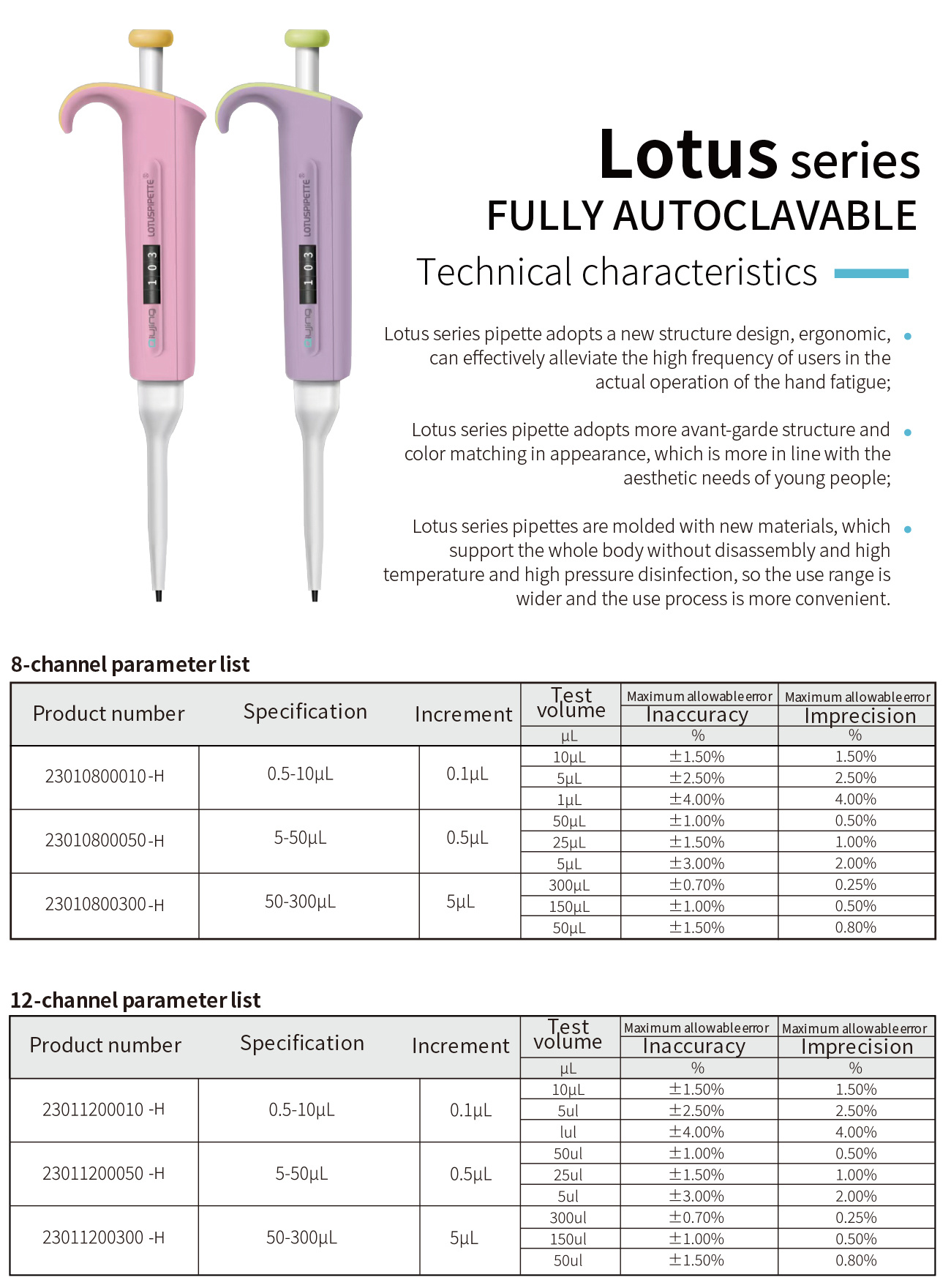 Molded from new materials, the Lotus series pipette supports high-temperature and high-pressure disinfection of the whole body without disassembly. This advantage not only expands its application range but also simplifies the operation process, making it more convenient for daily use in laboratories.