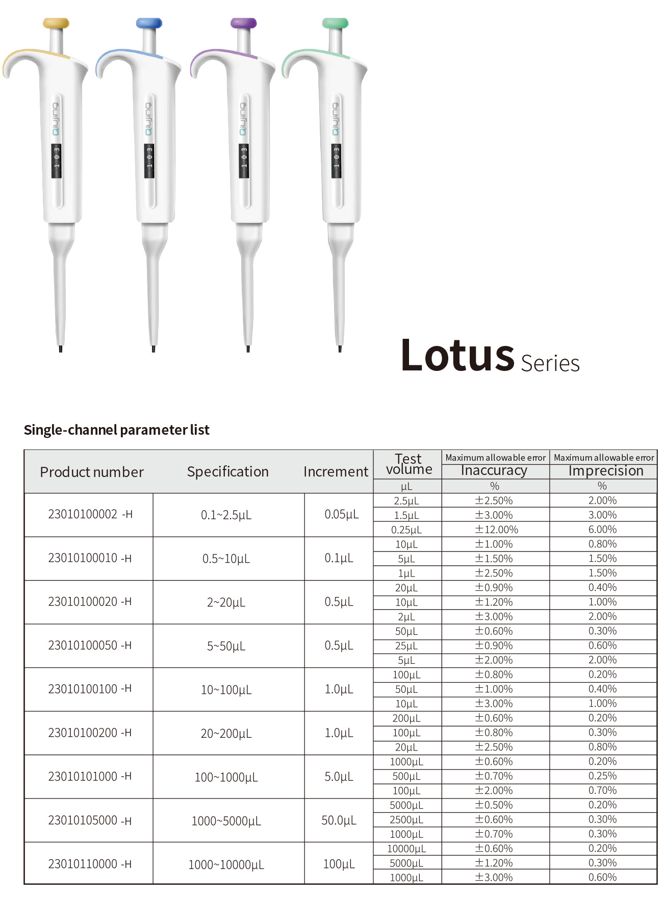 | 2301010002-H | 0 . 1 ~2 . 5μL | 0.05 μL | 2.5μL | ±2 .50% | 2 . 00% |