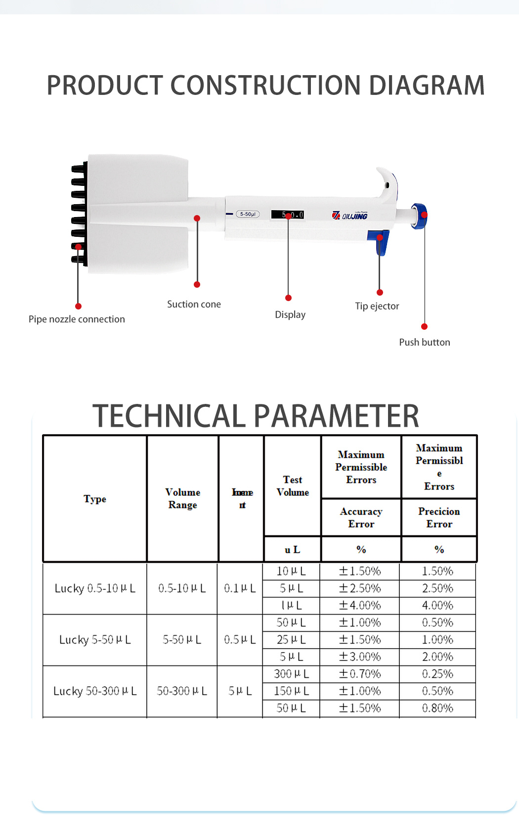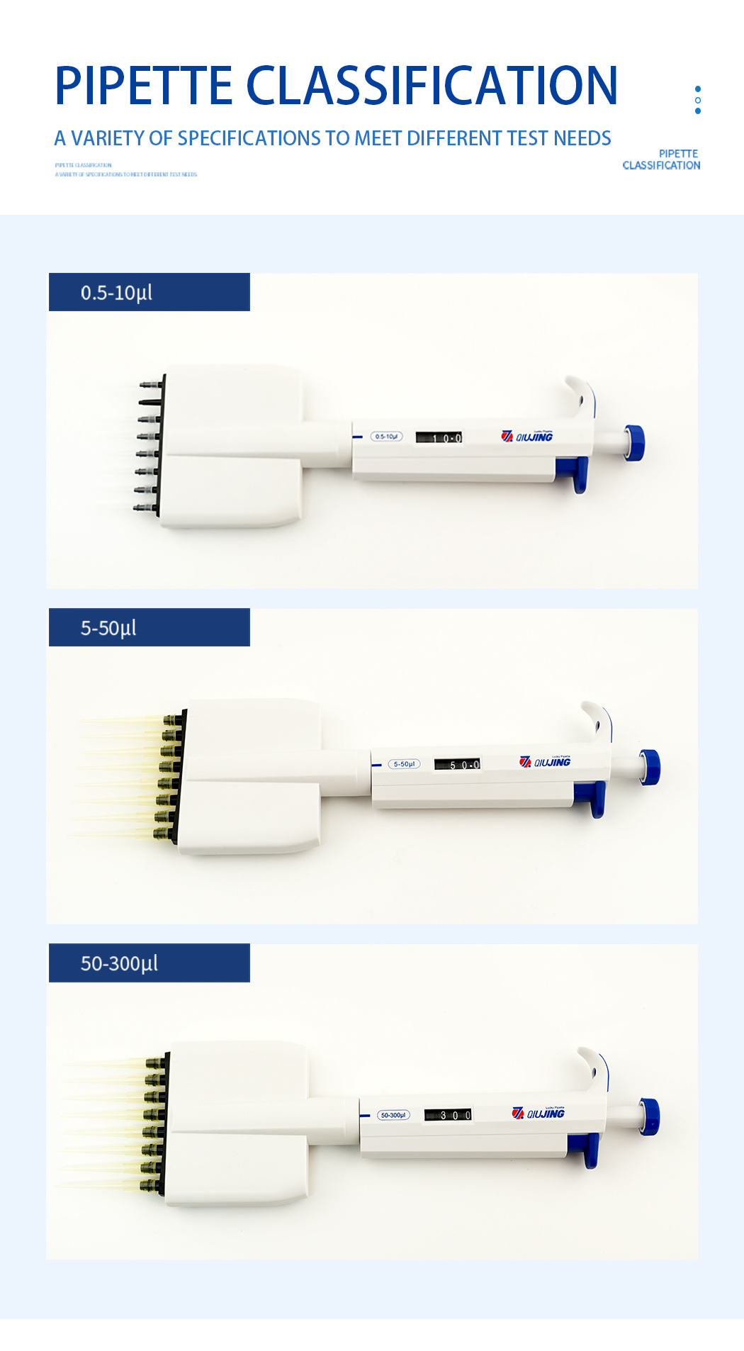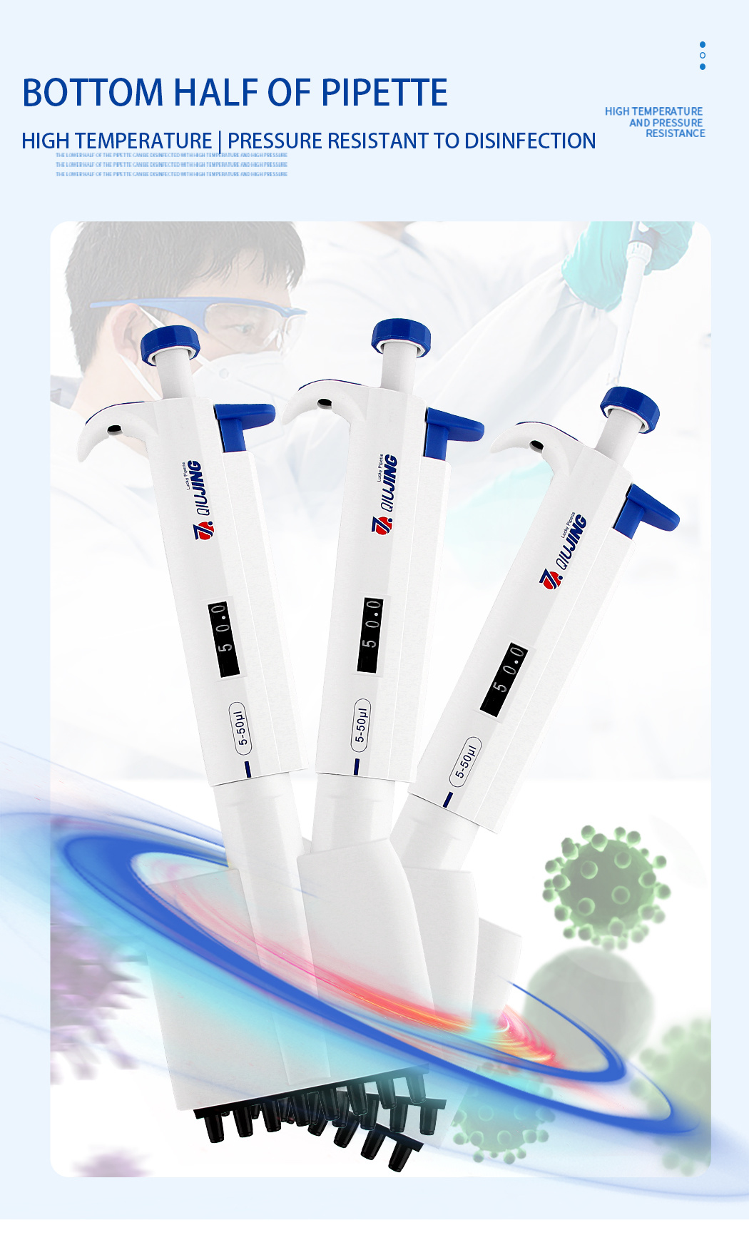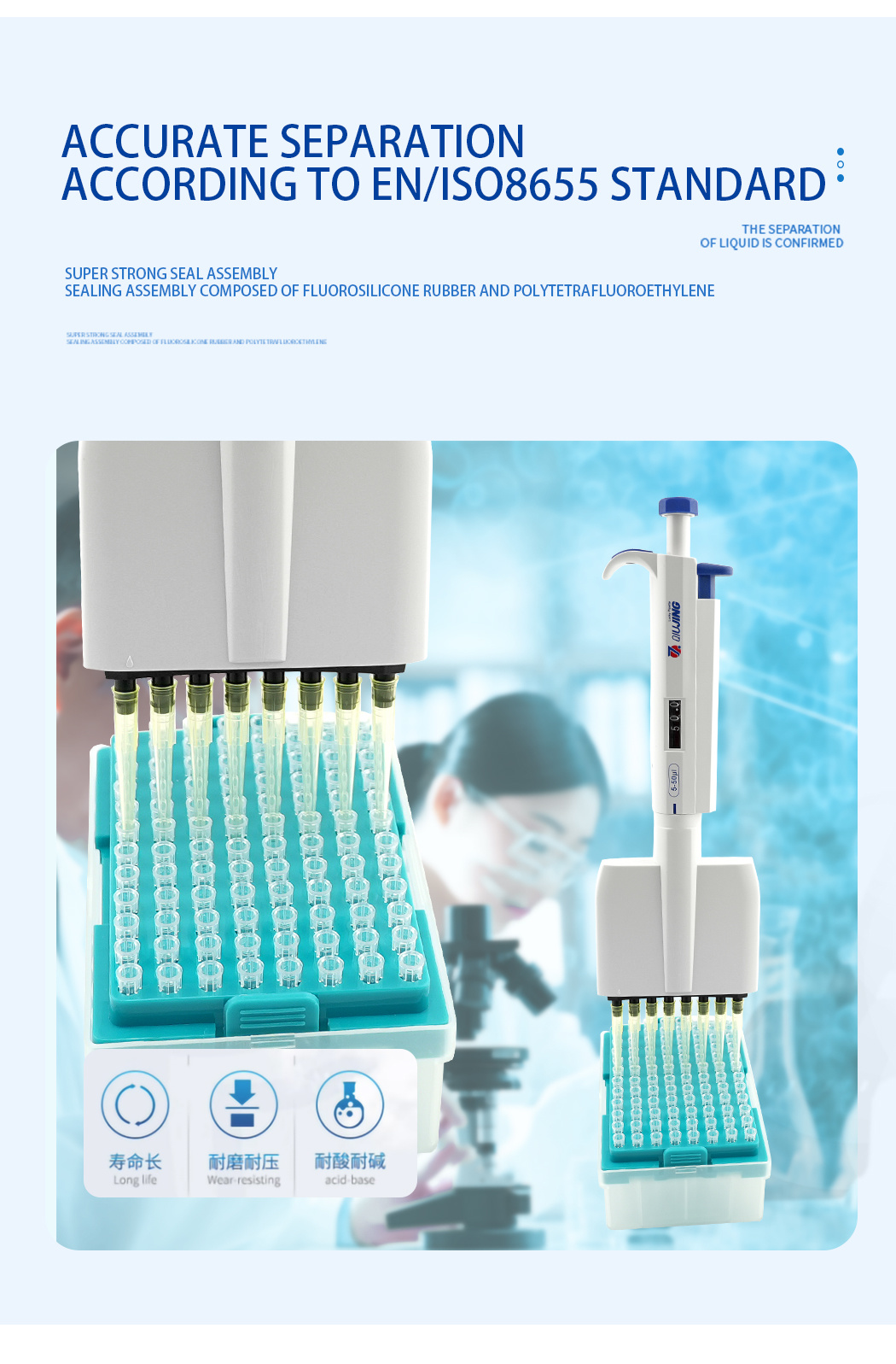 Endowed with reliable performance, these pipettes can better meet the diverse application needs of modern laboratories. They feature impact resistance, UV resistance, and chemical corrosion resistance, enabling them to perform stable liquid transfer work for a long time. Additionally, the pipette tip components are made of special materials; they are detachable, supporting high-temperature and high-pressure sterilization, and also allow independent range calibration.