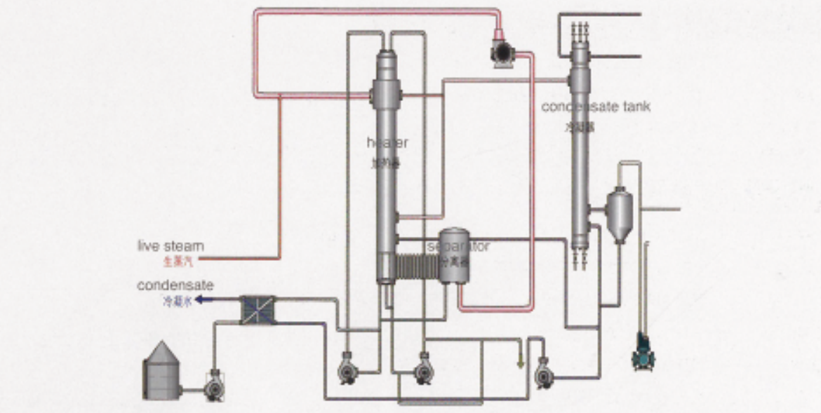 The MVR evaporation system uses a compression fan to compress and boost the secondary steam formed in theevaporation system, and the increased condensation temperature of the compressed secondary steam can be usedas the heat source of the evaporation system. Under suitable conditions, the system does not need to supplement rawsteam to complete evaporation; When the feed temperature is lower than the evaporation temperature of the svstemand when enough heat energy cannot be recovered from the concentrated solution and the condensed watelproduced by the system, a small amount of raw steam needs to be supplemented to preheat the materials to theboling point. Usually, the energy consumption of compressor fan for evaporating one ton of water is in the range of 15KW~30kW. Depending on the material characteristics, it wil also be lower or higher than this range.